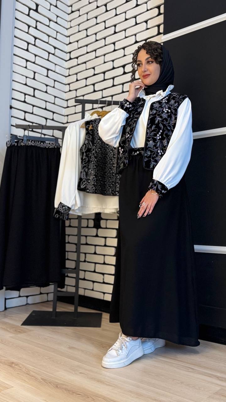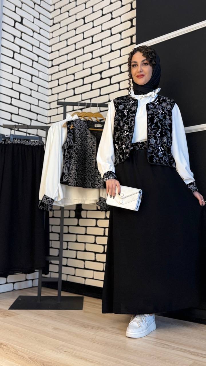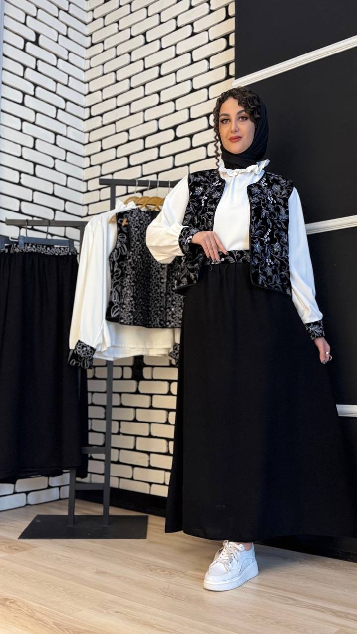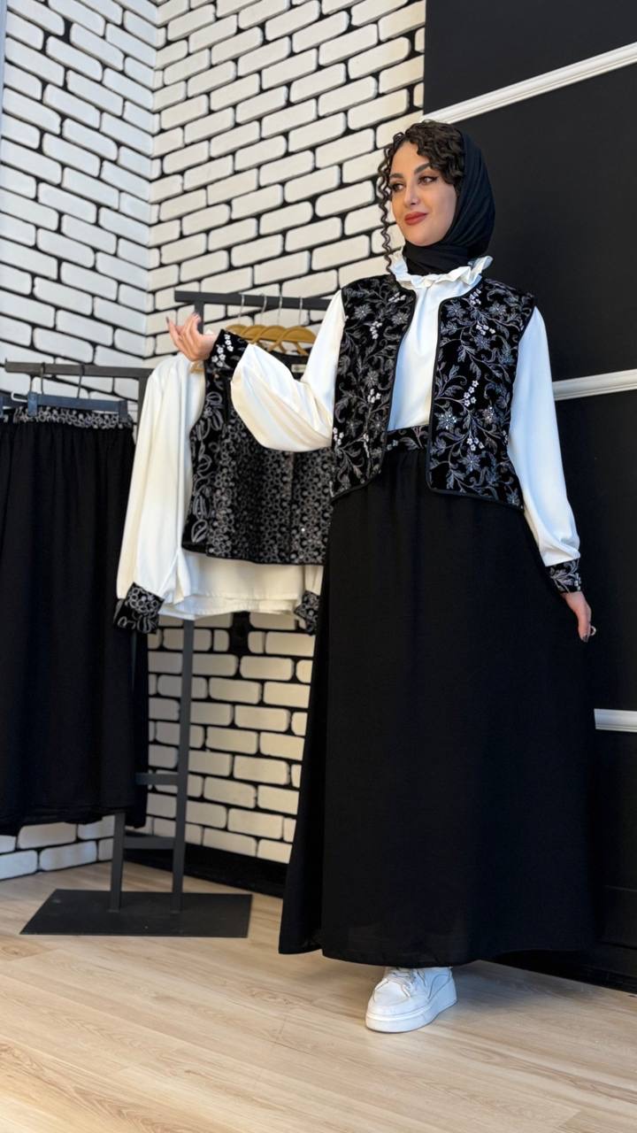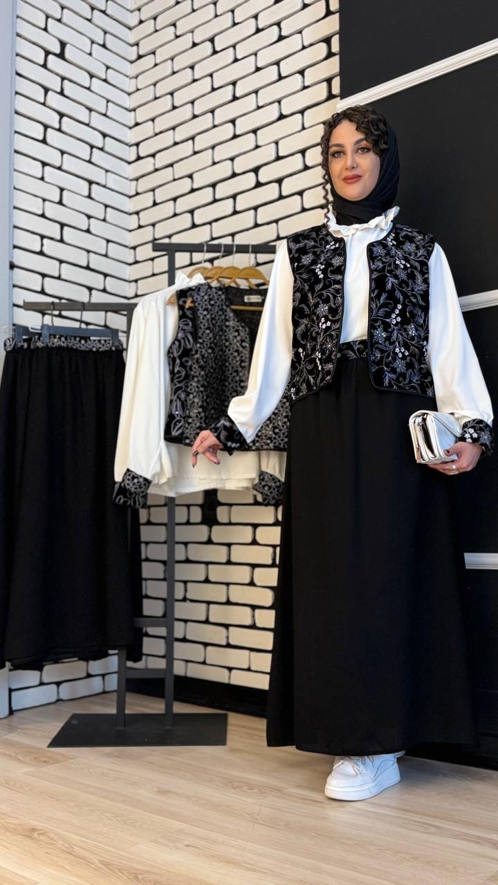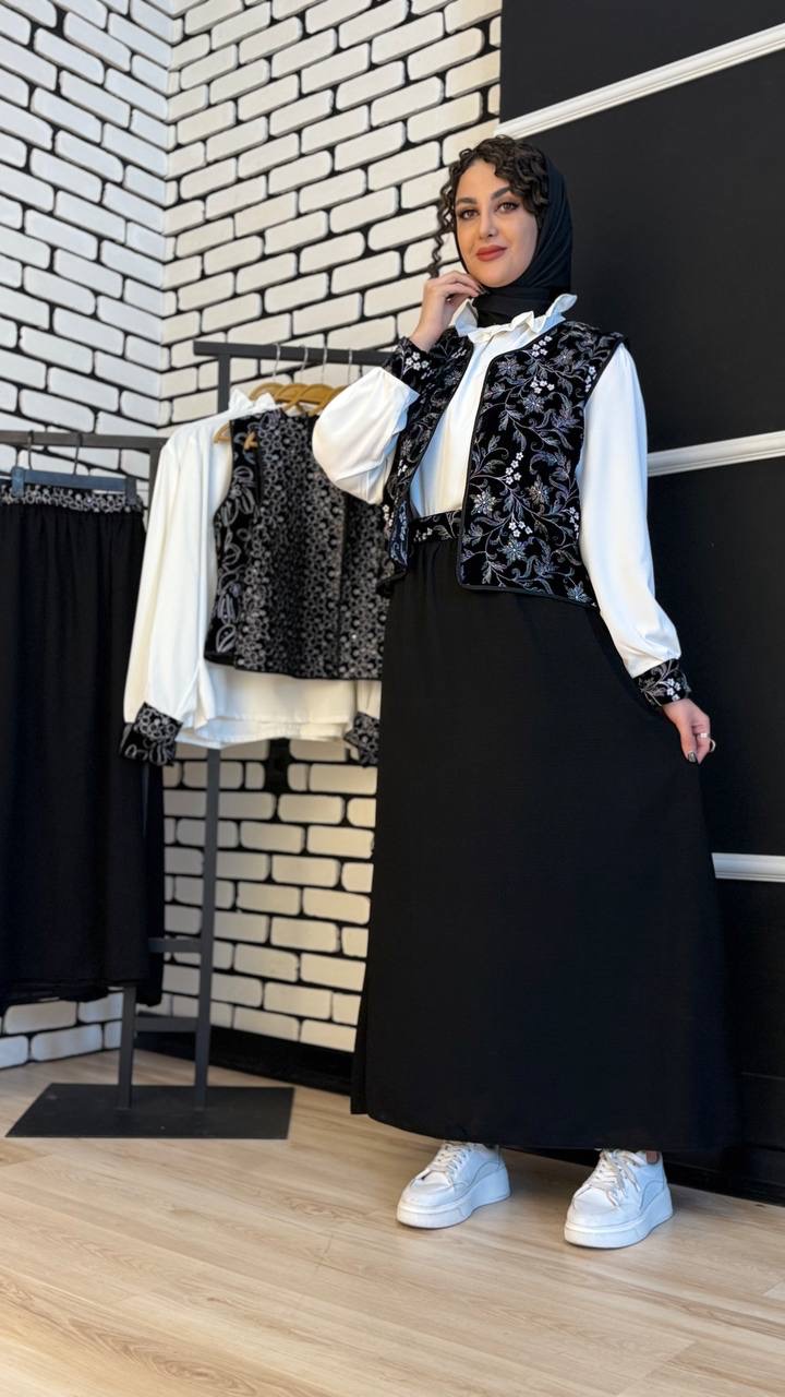 عنوان: ست3تیکه جلیقه سارافون و دامن سرمه دوزی سوزن دوزی دل آرا