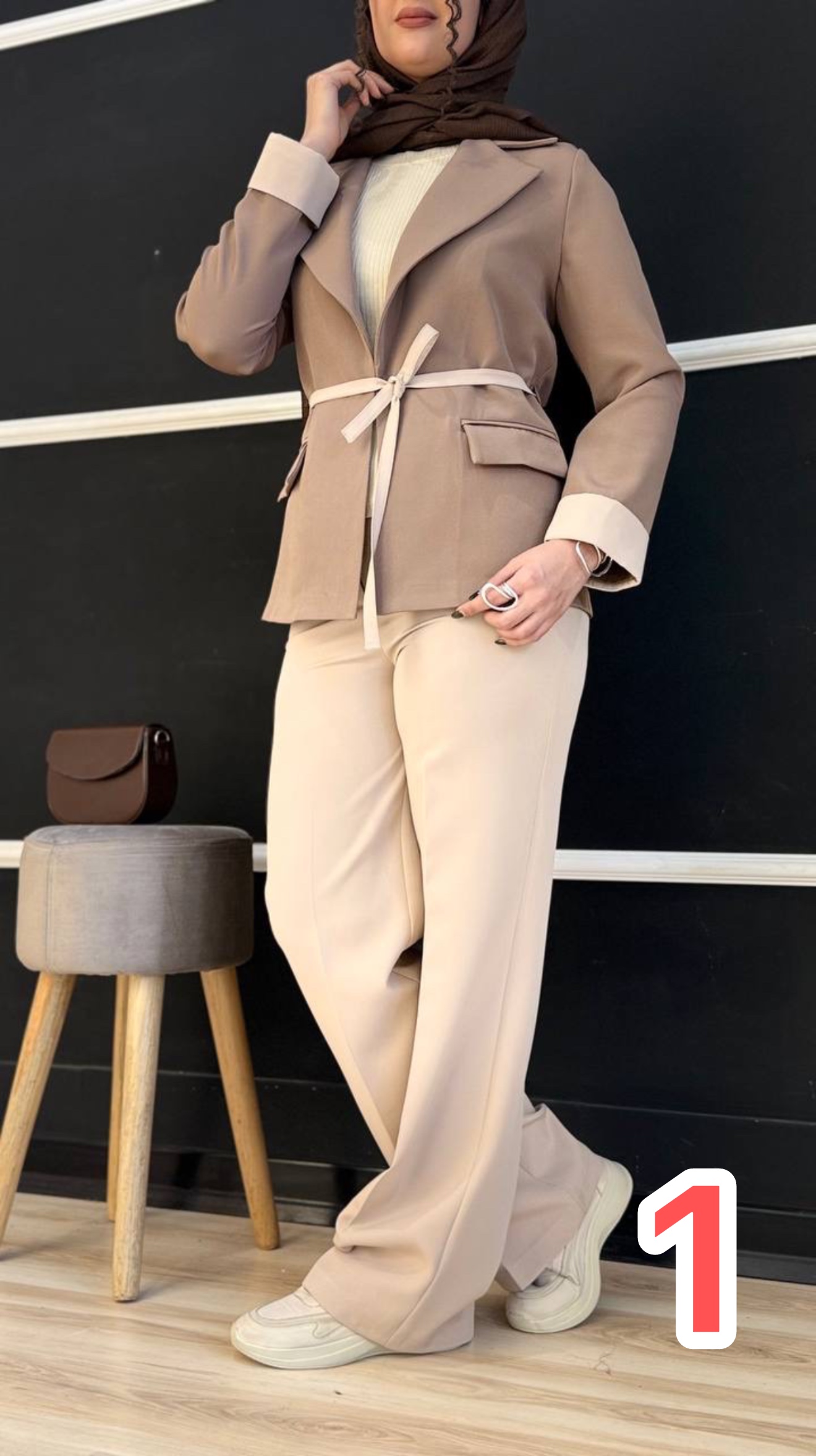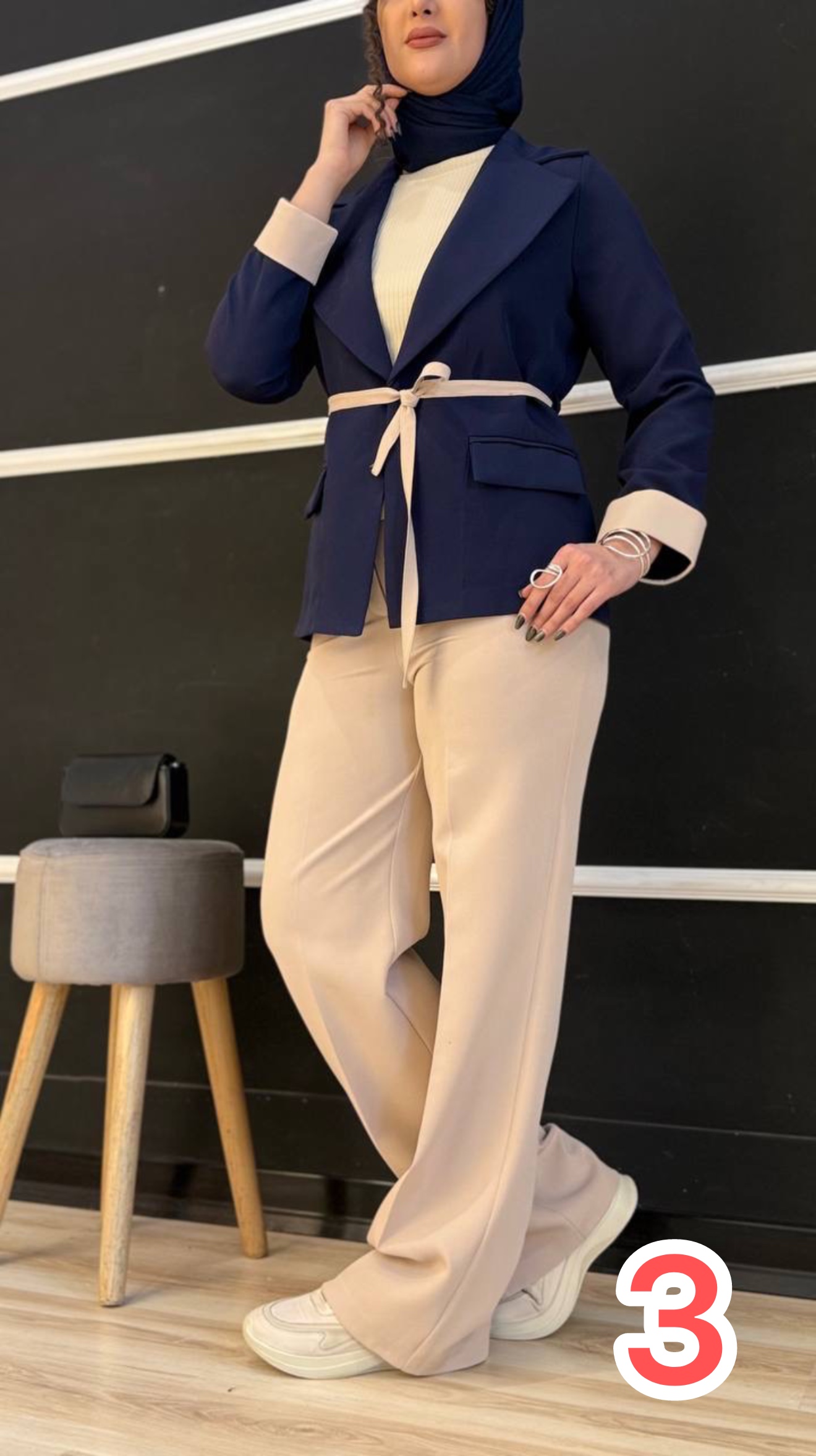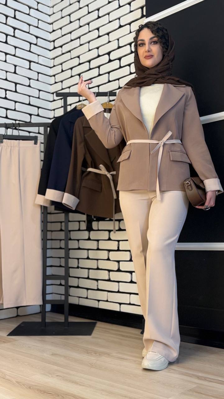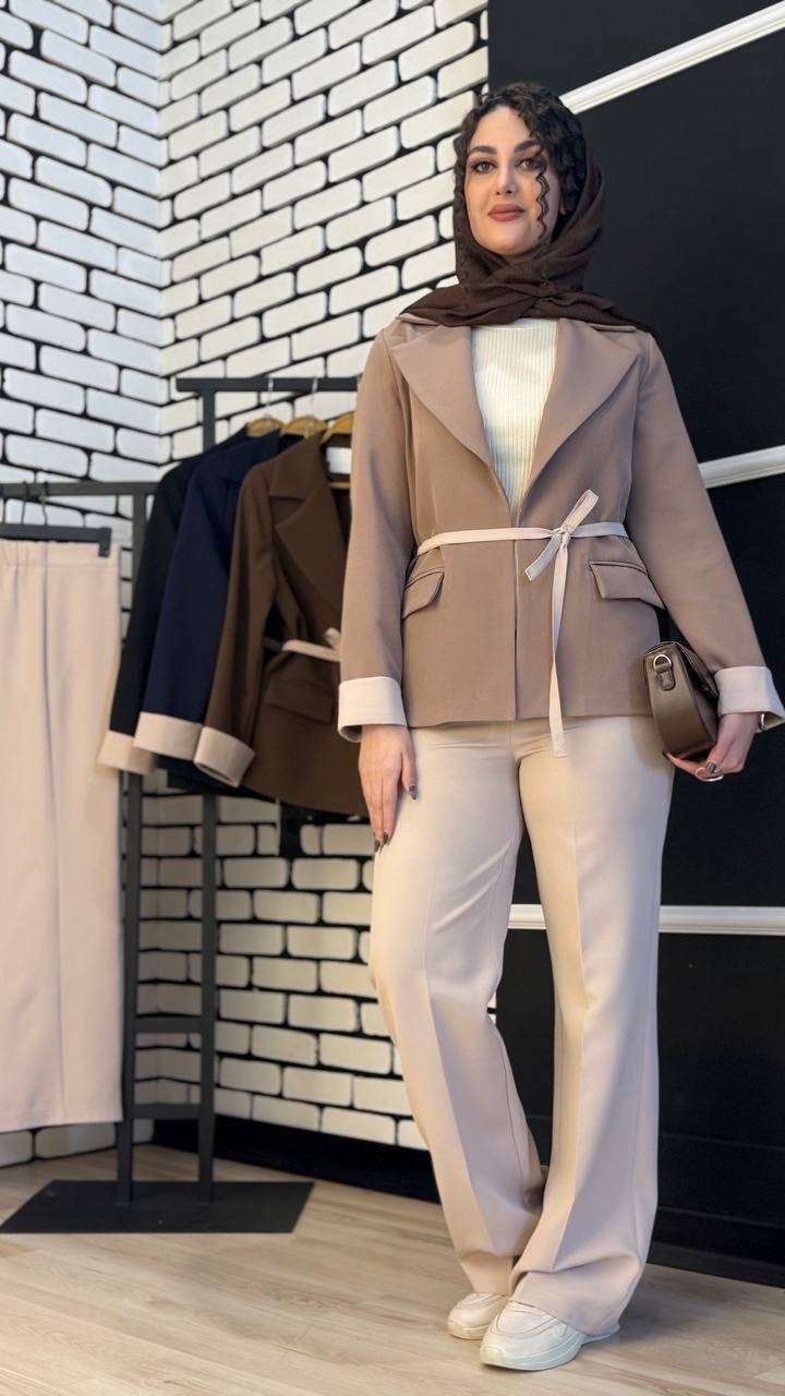 عنوان: کت و شلوار مزونی 2رنگ کمر بند دار مدل نیکول