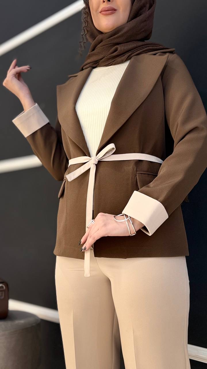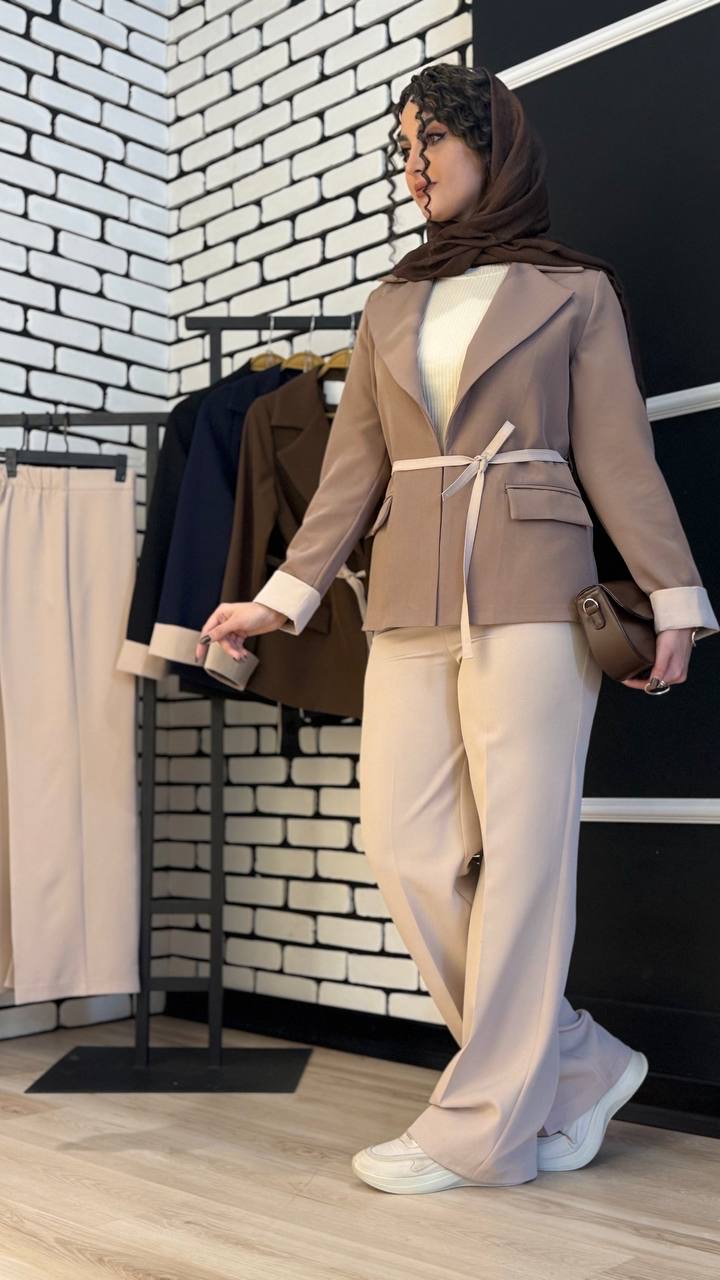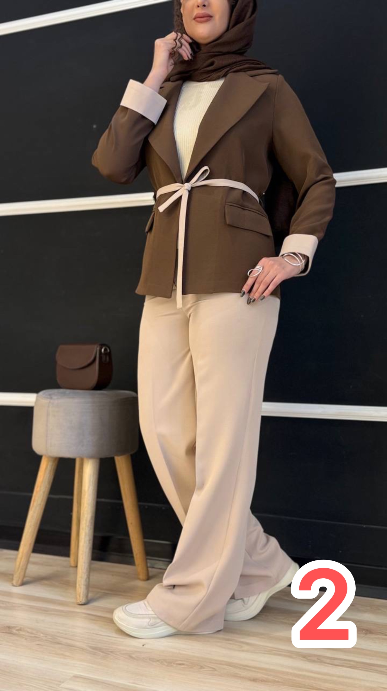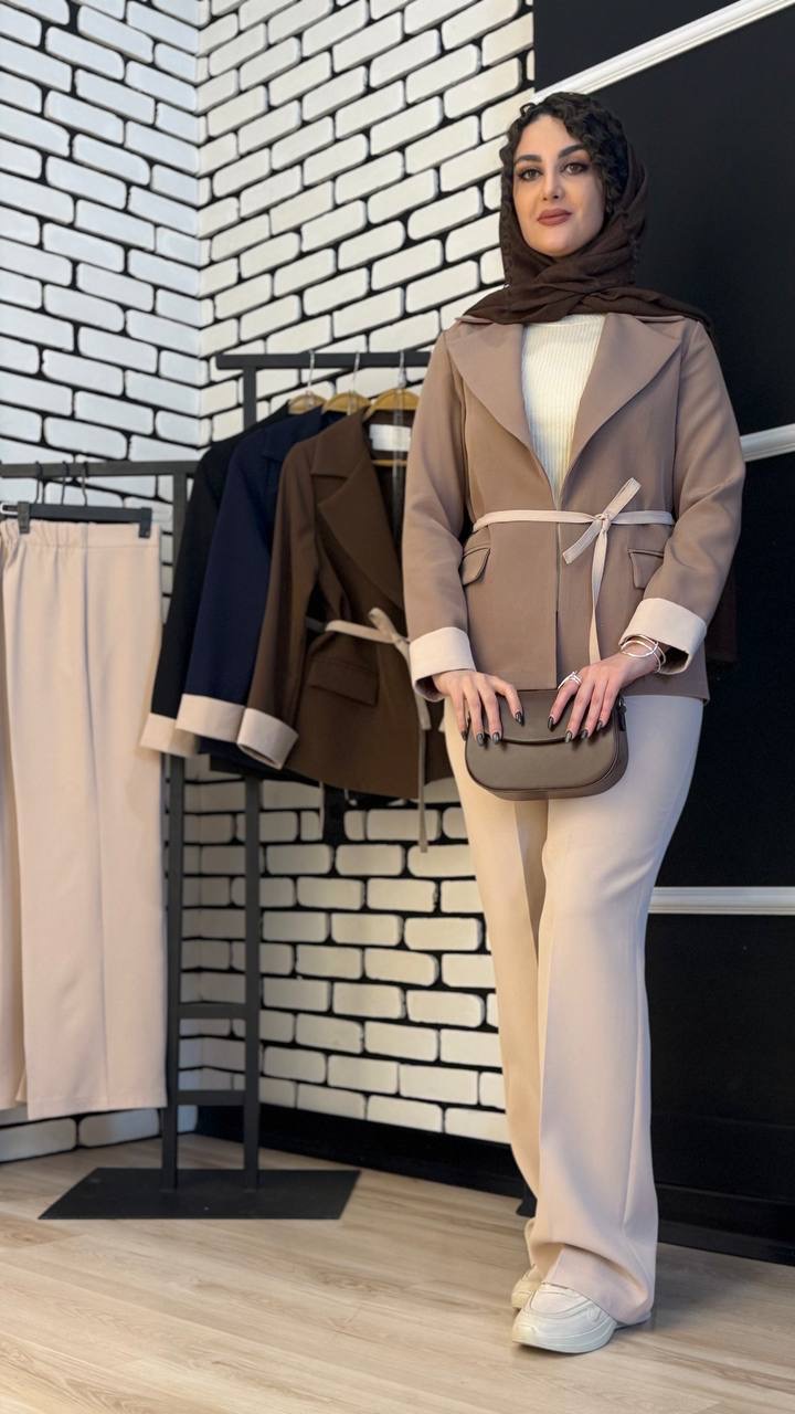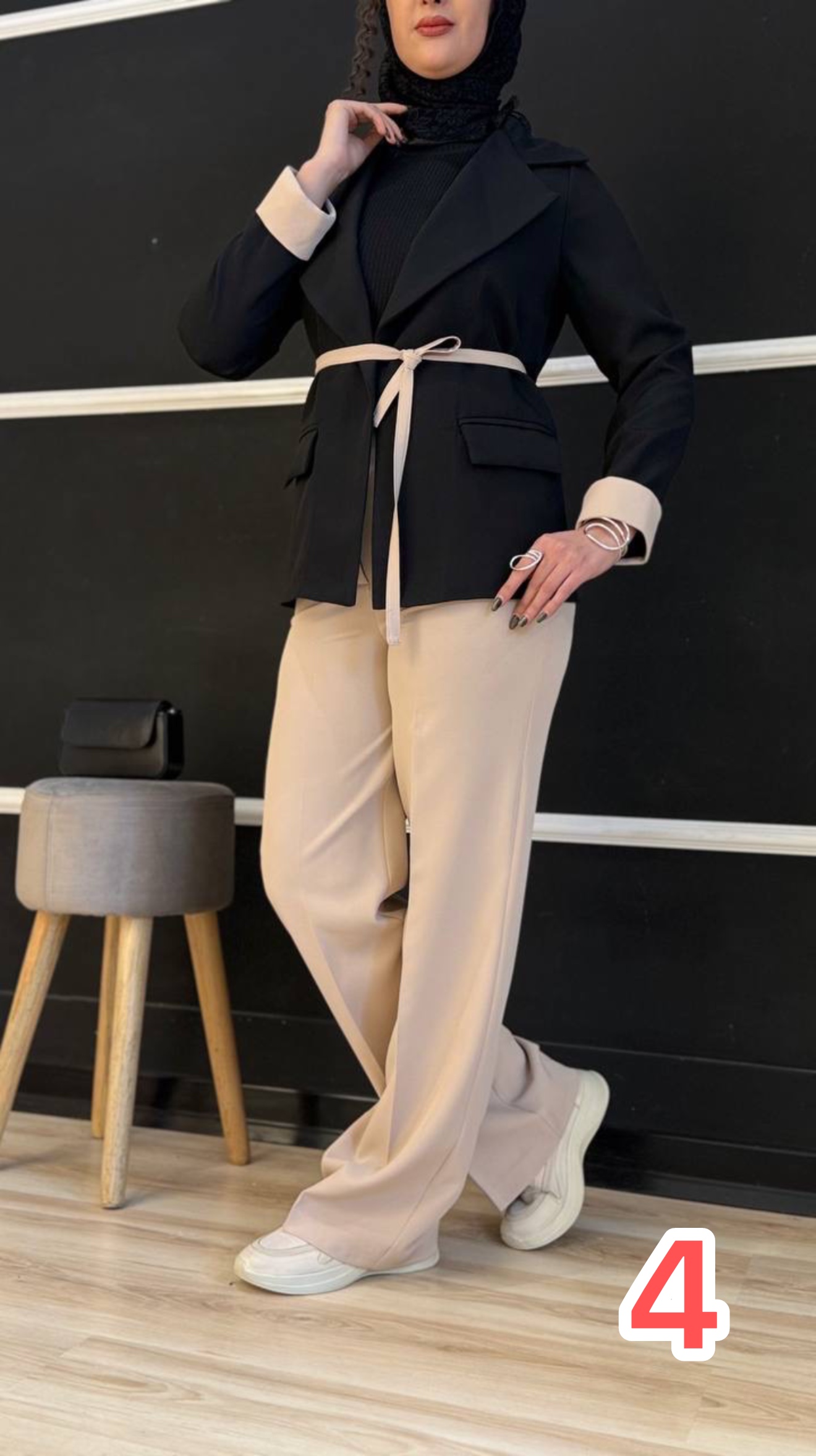 عنوان: کت و شلوار مزونی 2رنگ کمر بند دار مدل نیکول